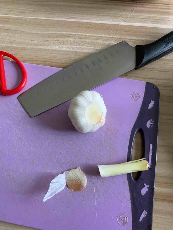 1、把蒜的外膜撕掉,切掉长茎。