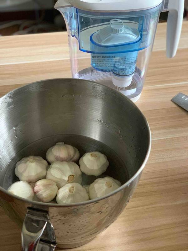 2、用过滤后的净水,加入少许盐,将大蒜浸泡24小时,24小时后将水倒掉再倒入新水,如此重复三天。