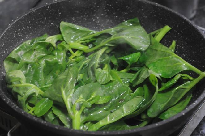 5、底下的青菜烫熟后,翻面,让所有的青菜都均匀受热至叶片变软。
