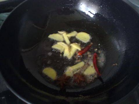 3、热锅凉油,把花椒、八角、姜、辣椒炒香。