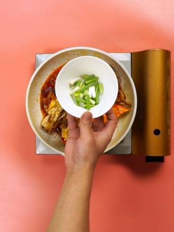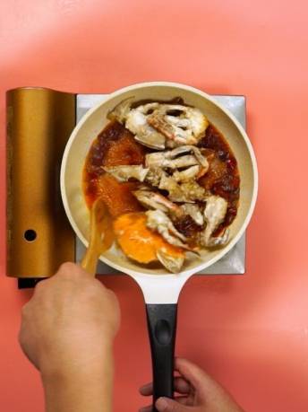 7、倒入清水20毫升、料酒、糖、盐,倒入梭子蟹,大火炖至收汁。