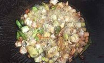 5、放生姜和肥肉丁,把肥肉的油炒出来一部分。