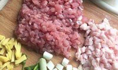 1、猪肉洗净,肥瘦分开切,切成小丁备用。