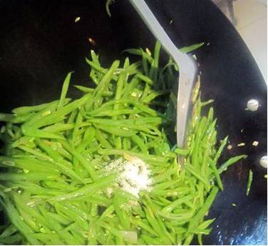 7、适时加点清水避免干锅,待到豆角变成翠绿色时放上少许的盐。