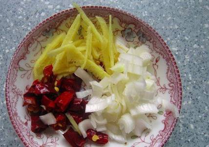 4、姜切丝,葱、干红辣椒切丁。