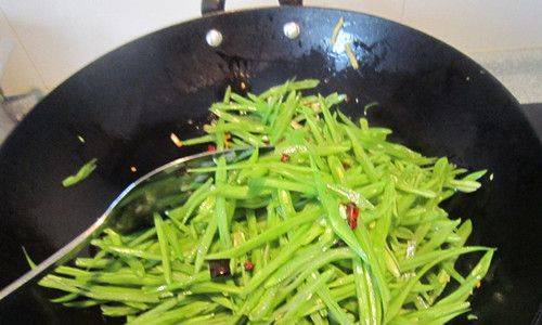 6、将切好的豆角丝倒入,快速均匀地翻炒。