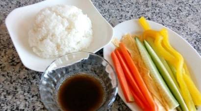 1、准备材料:紫菜3片、米饭2碗、寿司醋20克、火腿肠1根、鸡蛋1个、黄瓜半条、寿司萝卜3条、盐2克、胡萝卜半根。