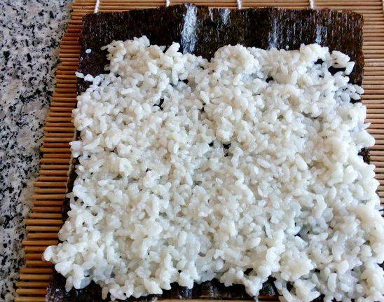 4、米饭拌寿司醋和盐,紫菜麻面朝上,放上米饭铺五分之四。
