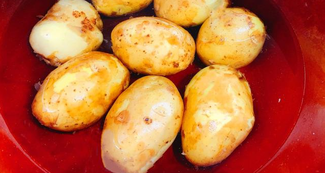 2、将捞出的土豆全部放入到太阳下,暴晒1~2小时左右,直到将土豆表面的水分完全晒干。