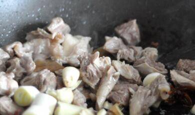 2、炒锅内烧热2大勺油,爆香葱段、姜片、大蒜粒等辛香料。