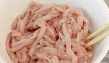 2、把肉先切成片,再切丝,最后切成小颗粒。放入碗中,加入四分之一茶匙(1克)盐,搅匀后腌制20分钟。
