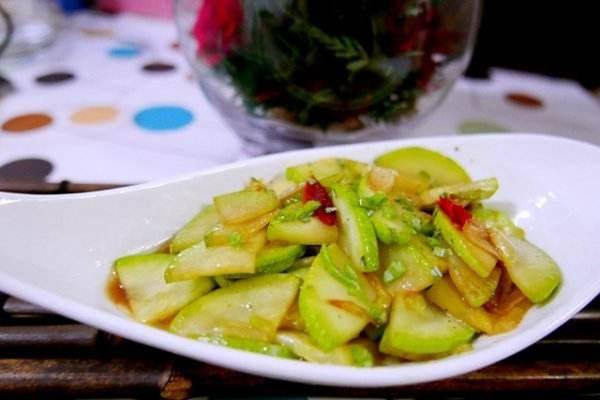 5、醋溜西葫芦:西葫芦洗净去皮,切成薄片;锅中放入少量植物油,小火加热至油六成热;放入掰开的干辣椒,小火慢炒至辣椒籽发黄,发出香味;放入西葫芦片,大火爆炒至西葫芦变色;加入适量食盐和花椒粉,再翻炒数分钟;加一点点水,盖上盖子焖一下,然后再翻炒收汁;倒入一小勺米醋,翻炒一下,出锅即可。
