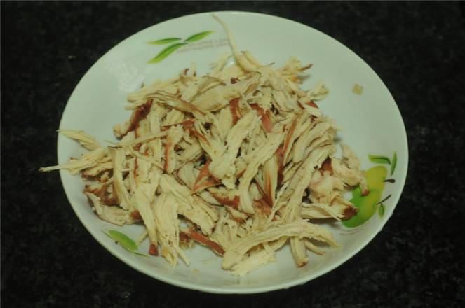 4、卤鸡胸肉撕成条。