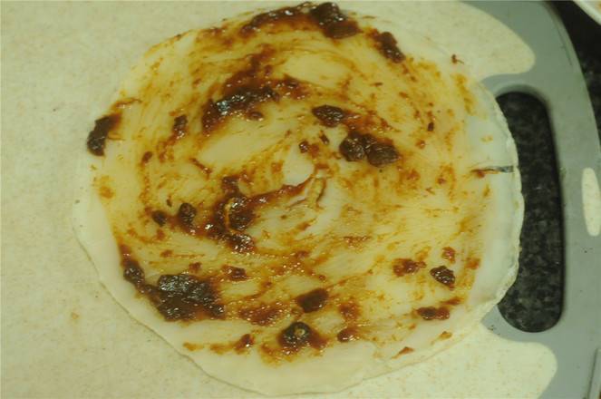 7、将饼皮放在案板上,抹上少许甜面酱。
