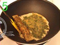5、等蛋液即将凝固而尚未凝固时,用铲子从一边卷起。