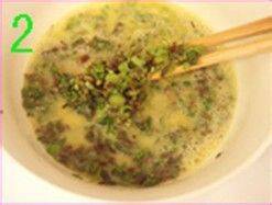 3、挤掉香椿的水分切碎,放入鸡蛋液里拌匀,加少许盐调味。
