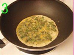 4、热锅少油小火,将调好的香椿蛋汁薄薄地铺一层在锅底。