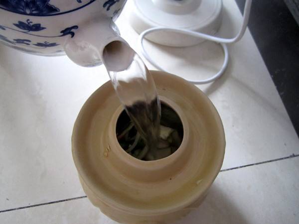 8、烧一壶开水,趁热直接淋入辣椒中。