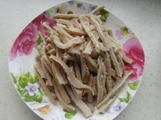 1、把熟牛肚洗净,去掉牛肚上的筋,用开水加八角料酒香叶煮20分钟左右捞起切丝。
