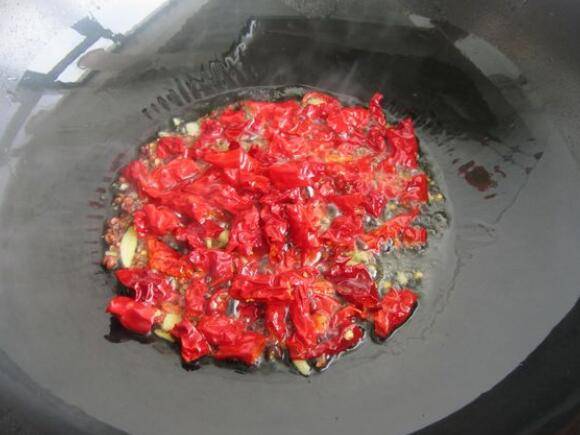 4、热锅凉油加花椒粒姜辣皮子炒出香味。
