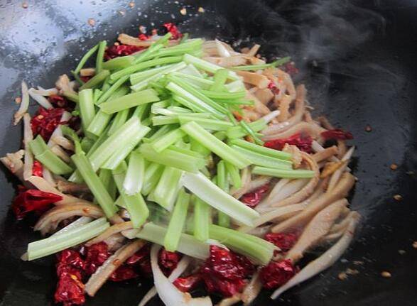 准备材料:熟牛肚400克、植物油适量、盐适量、辣皮子10个、毛芹菜50克、洋葱50克、花椒粉2克。