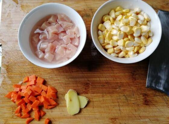 1、鸡胸肉清洗干净,然后切成合适大小的丁玉米粒现剥出来,清洗干净沥干水分备用,或者可以用现成冷冻玉米粒,提前拿出解冻。胡萝卜去皮,洗净切丁。姜切片。
