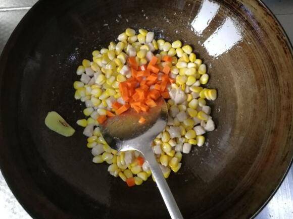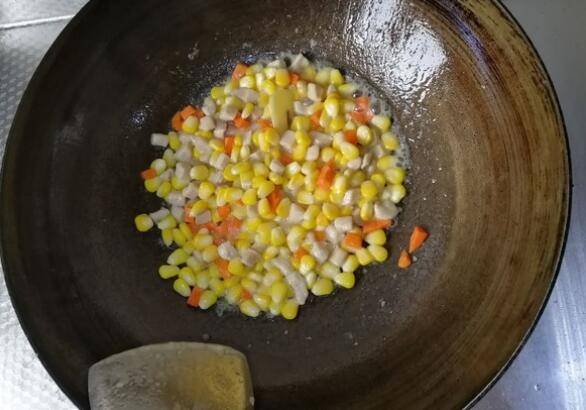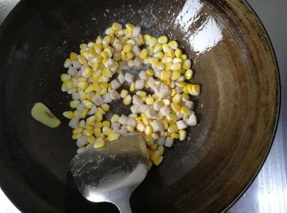 4、倒入腌制好的鸡胸肉丁,开始翻炒,炒到鸡胸肉表面变色,倒入玉米粒,翻炒1分钟。