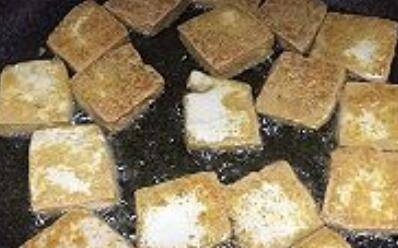 3、热锅冷油,豆腐两面分别煎透,金黄为止。捞出控油。