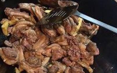 2、油烧热,加水鸭块翻炒表明变色,加姜片继续翻炒三分钟左右。