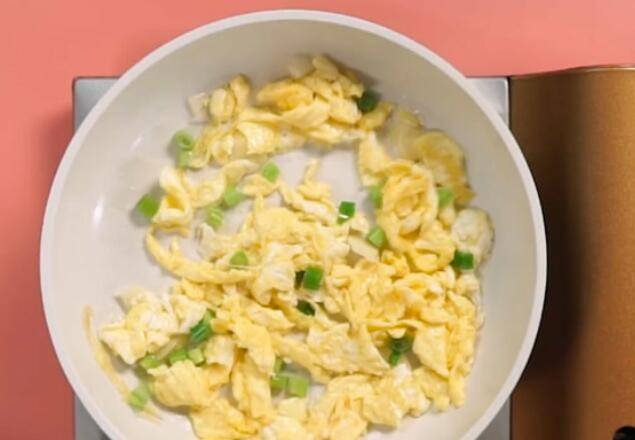 4、倒入食用油,倒入蛋液,大火炒熟,加葱花和蒜片,翻炒均匀。