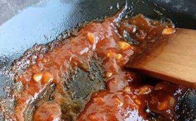 1、锅中放适量水开火,将辣酱和白糖一起放入水中慢慢搅拌至融化。