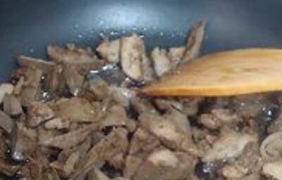3、热锅,倒油,把切好卤水鸭肝,放在锅中翻炒。