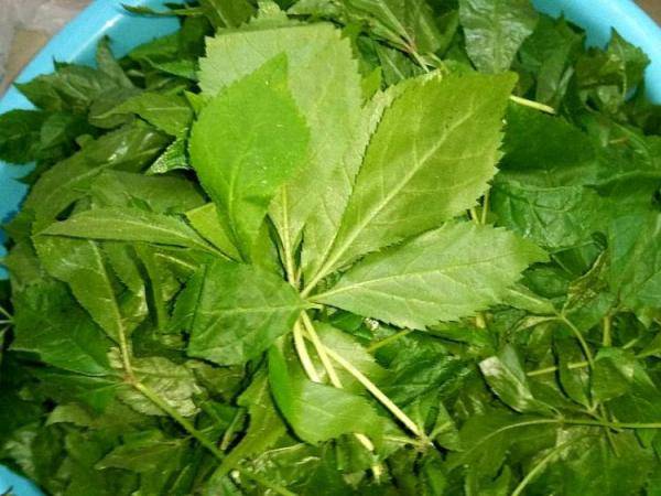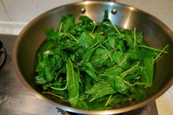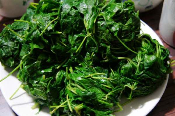 4、从锅中捞出刺五加叶过冷水,然后捞出沥干水分,切碎备用。