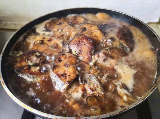 7、大火烧开,放入煎至金黄的鲅鱼块,再加入老抽增色,再加入两大勺料酒,目的是去腥。