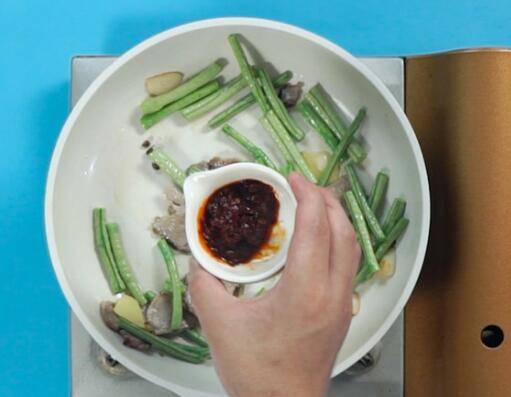 准备材料:豆角200克、猪肉50克、食用油3毫升、大蒜1瓣、姜片3克、辣椒适量、花椒1克、豆瓣酱5克、生抽3克、白砂糖3克、盐2克、鸡粉3克。