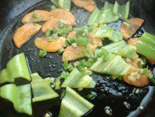 2、炒青椒片、胡萝卜片。放入葱末、姜末。