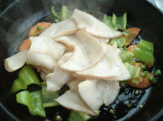 3、放入鲍鱼片,大火翻炒。