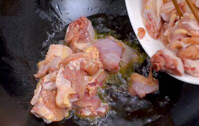 3、在锅里加入油,烧热后,倒入鸡肉。