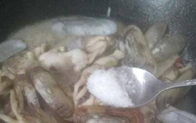 4、倒入蛏子翻炒十几秒后加入料酒。