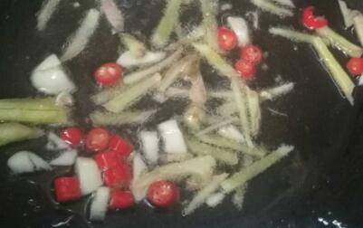 3、锅内热油放入大蒜,姜丝,小米椒炒出香味。