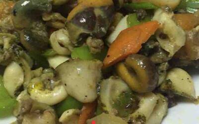 6、海螺黄和螺肉片一起放,放盐、味精、胡椒粉、香油。