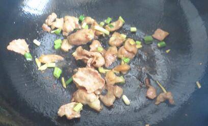 4、葱姜切好,锅中烧热油下入肉片炒至变色。
