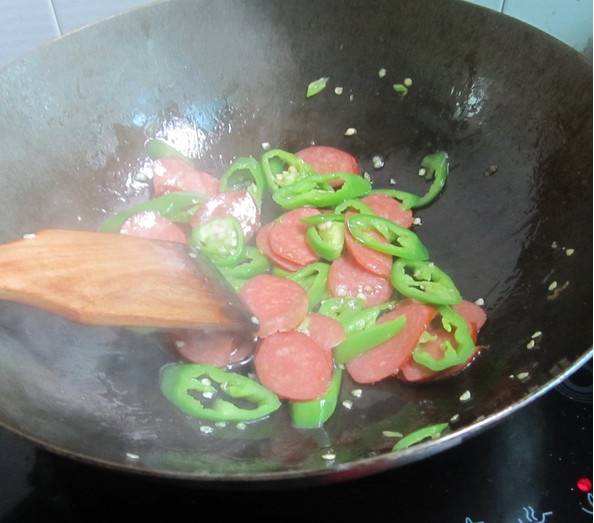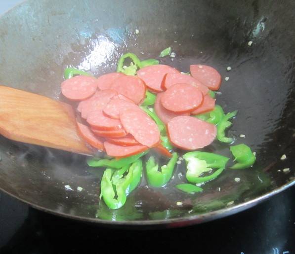 4、放进烤肠,炒匀。
