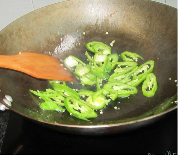 3、炒青椒,放盐,炒至断生。