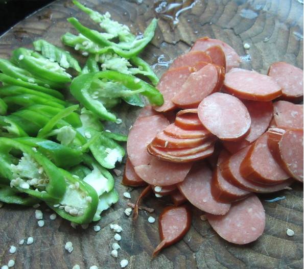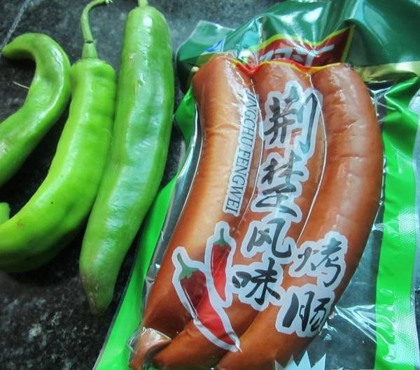 2、青椒切丝,烤肠切片。