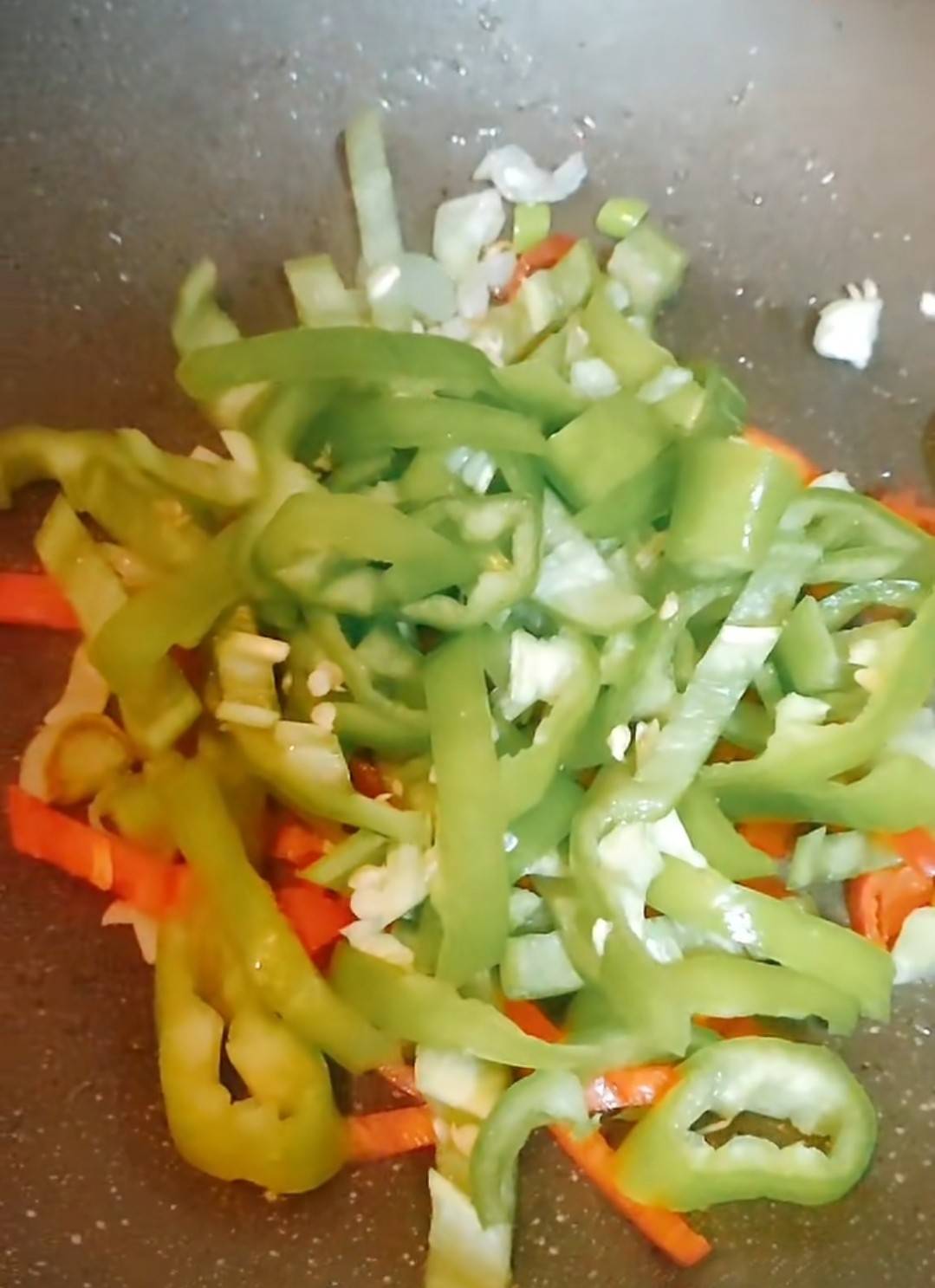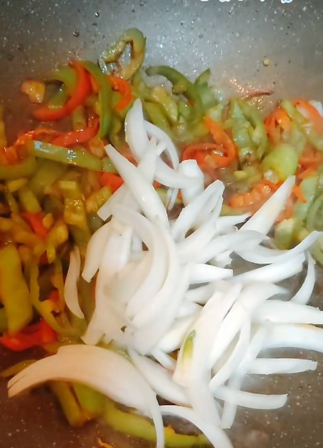 1、准备材料:馒头2个、鸡蛋3个、青椒2个、红椒2个、洋葱半个、葱花少量、姜丝少量、生抽适量、蚝油适量、盐适量、纯净水少许。