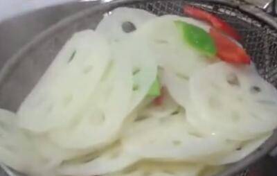2、锅中烧水,放适量盐,放入藕片、青红椒片,煮30秒捞出,放入凉水过凉。