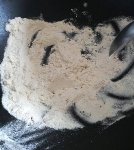 2、面粉倒入锅中炒制微黄炒,加入炒熟的坚果翻拌均匀。
