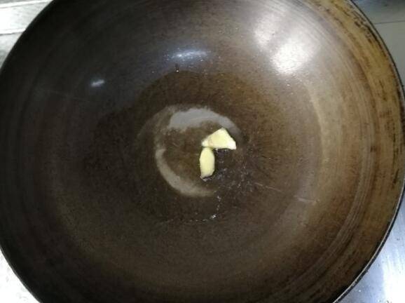 2、干净无水锅里倒入玉米油,开大火烧热,下姜片爆香。
