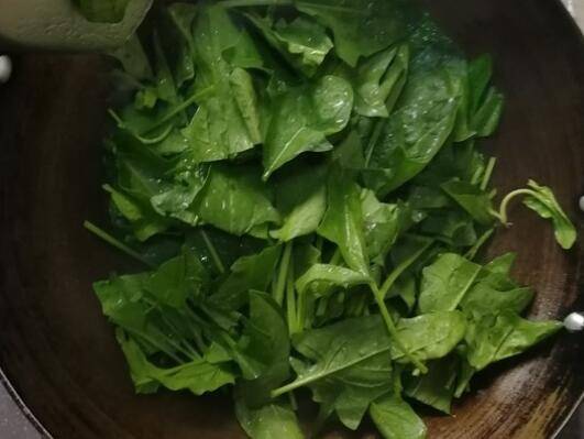 3、倒入菠菜段,开始翻炒,炒到菠菜变软。